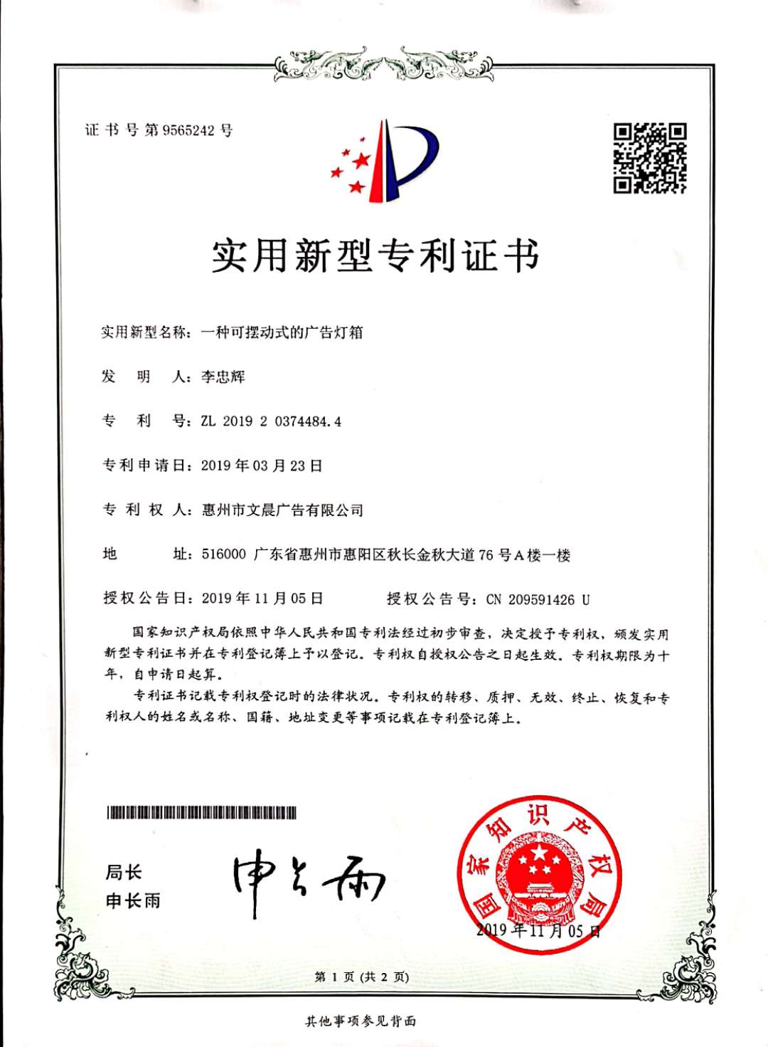 專利證書?PATENT CERTIFICATE